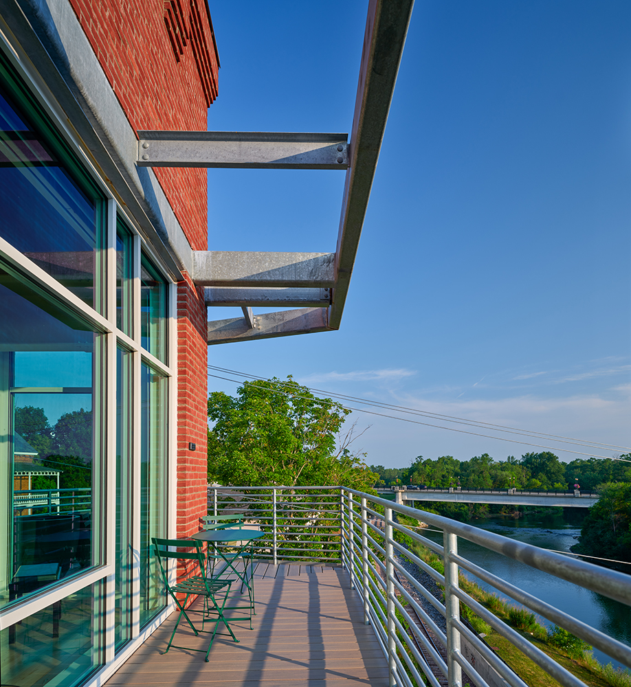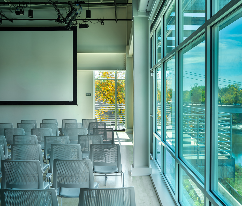 The new Annex addresses these challenges with dedicated spaces for performance, learning, and production. The lower level includes a fully equipped scene shop that expands production capacity and supports technical education. The ground floor houses the Center for Learning & Engagement with classrooms and flexible workshop space, and the upper level includes an adaptable performance studio with bar, lounge, and balcony seating. An outdoor plaza between the historic theater and the addition serves both as a venue for outdoor performances and an informal gathering place for the community.